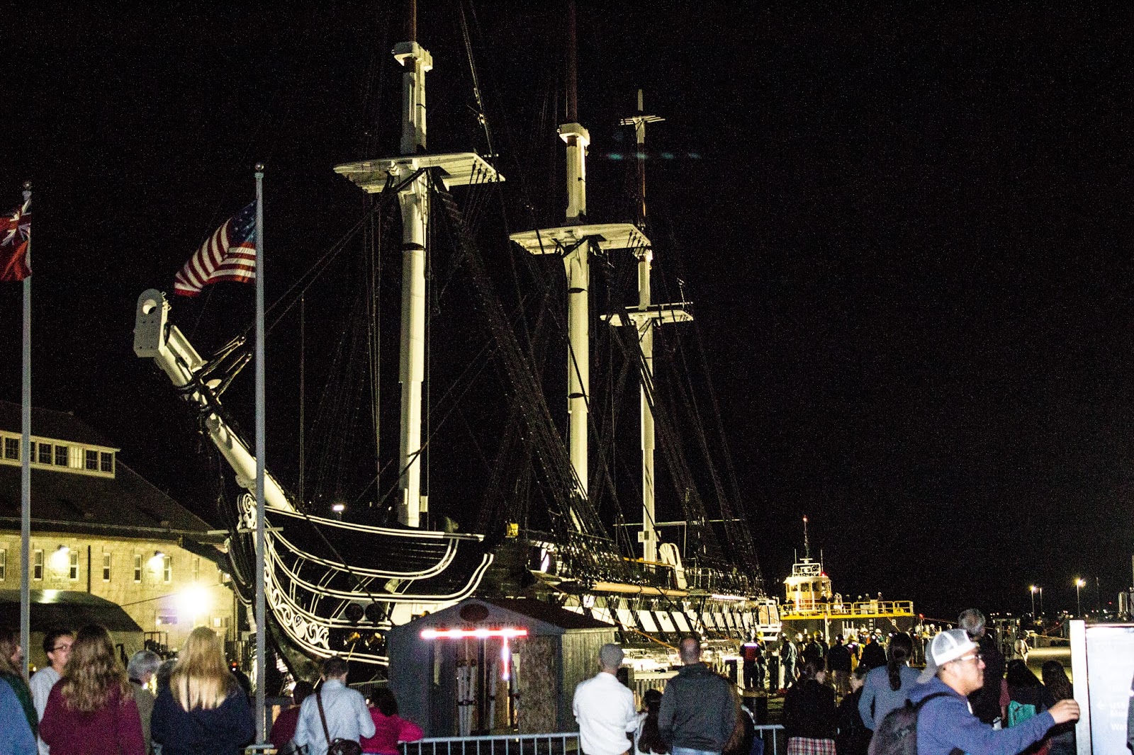 We arrived about 8:30 this Sunday night. Presumably the water is still being let into the dry dock and Old Ironsides is lifting to be on its own for the first time in a couple of months over two years while much work was done on her overhaul.
